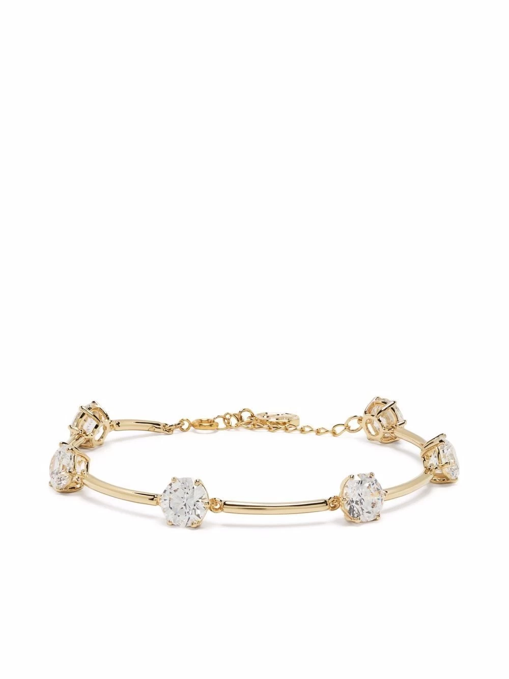 Swarovski’s bracelet is designed to evoke the mysterious feel of the cosmos. This slim iteration is strung with a neat row of round brilliant-cut Swarovski crystals depicting stars in the sky and connected with matte-effect gold-tone links.Â