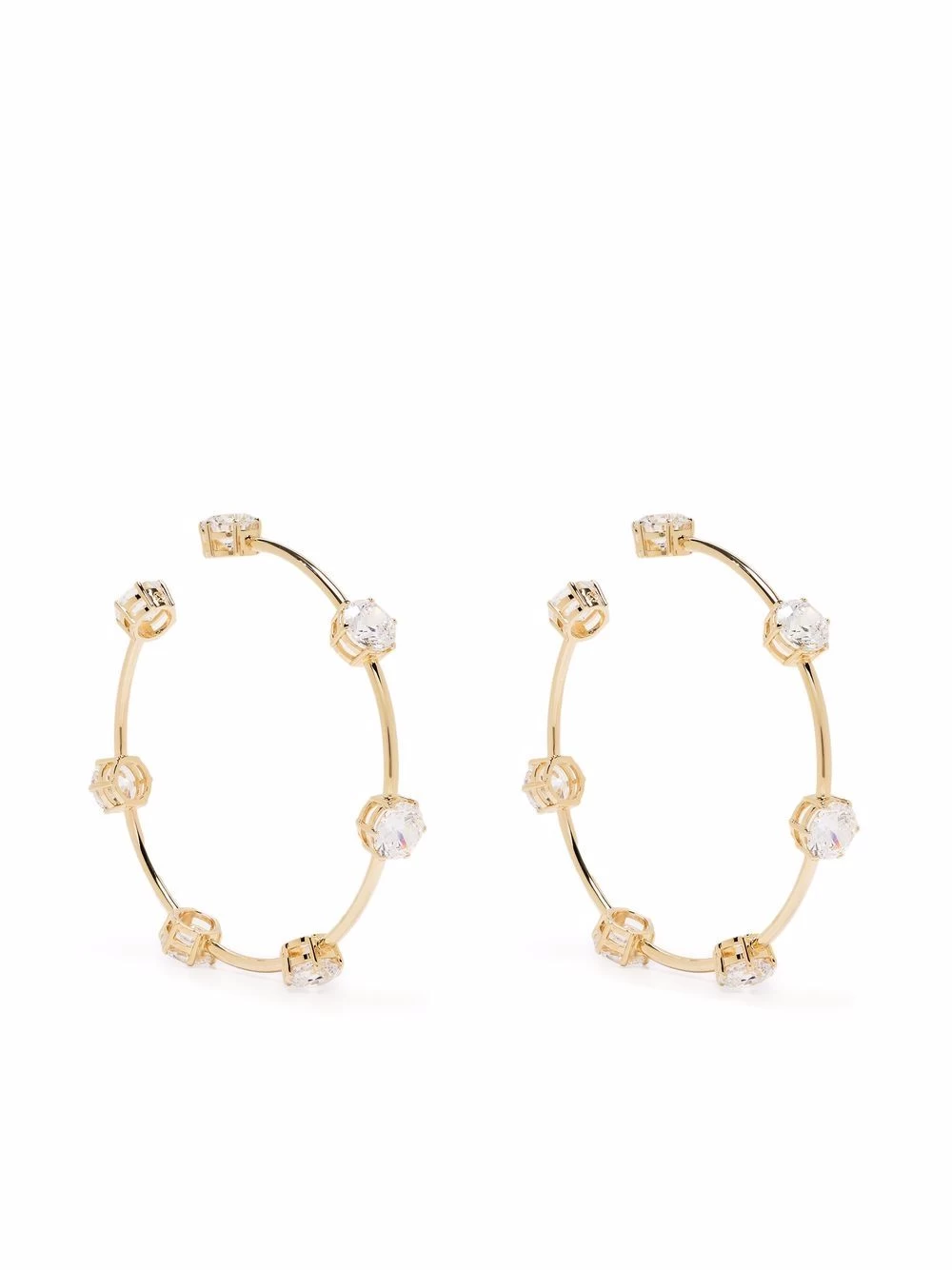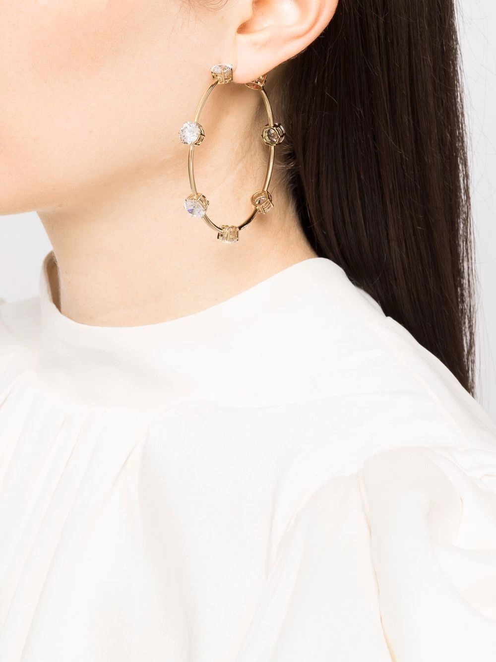 Gold-tone brass Constella crystal hoop earrings from Swarovski featuring gold plated, large hoop design, crystal embellishment and post-back fastening. These earrings come as a pair..