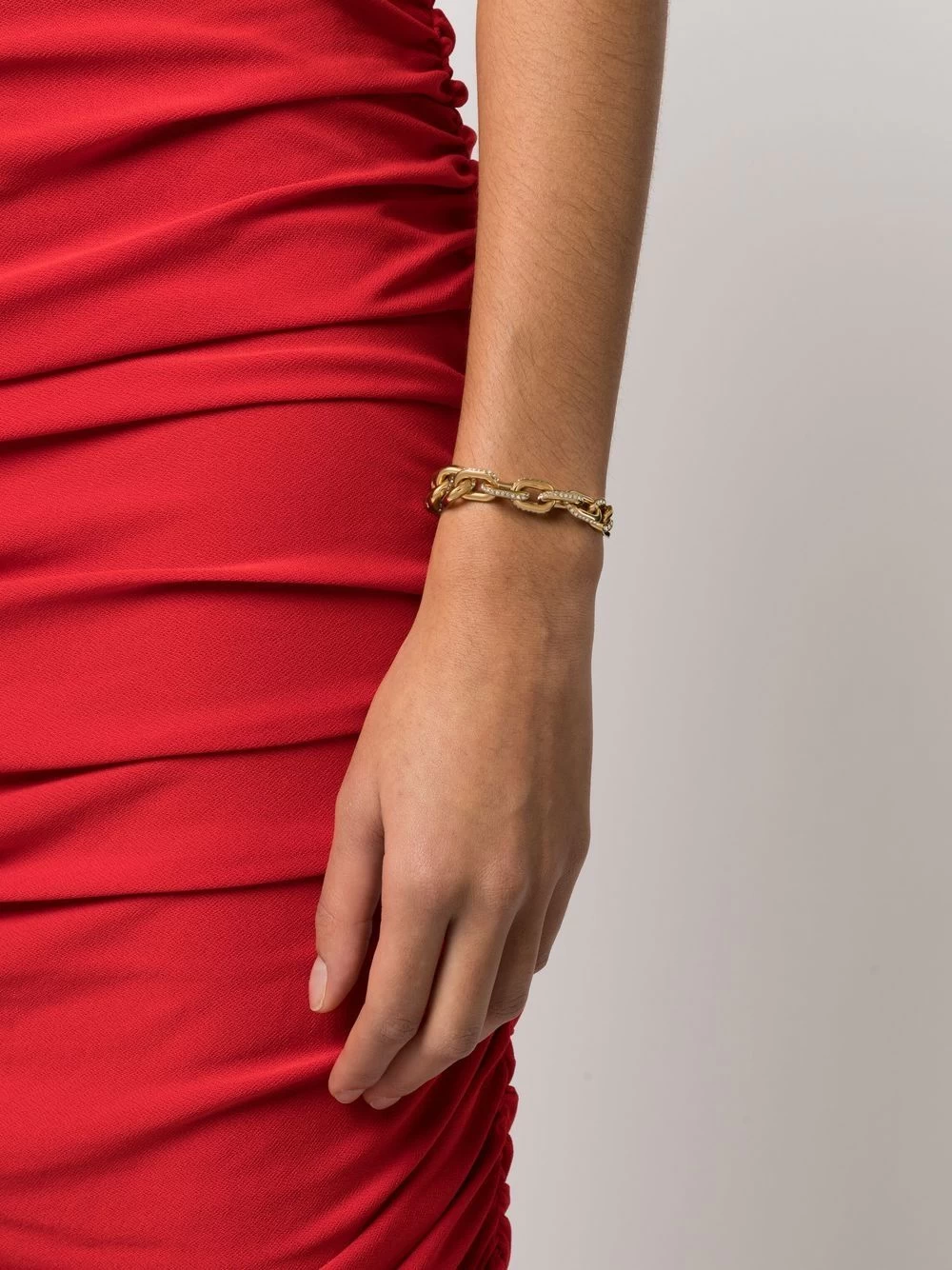 Dextera pavé bracelet from Swarovski featuring curb chain, logo charm, pavé setting, spring-ring fastening, gold-tone and gold plated/crystal.