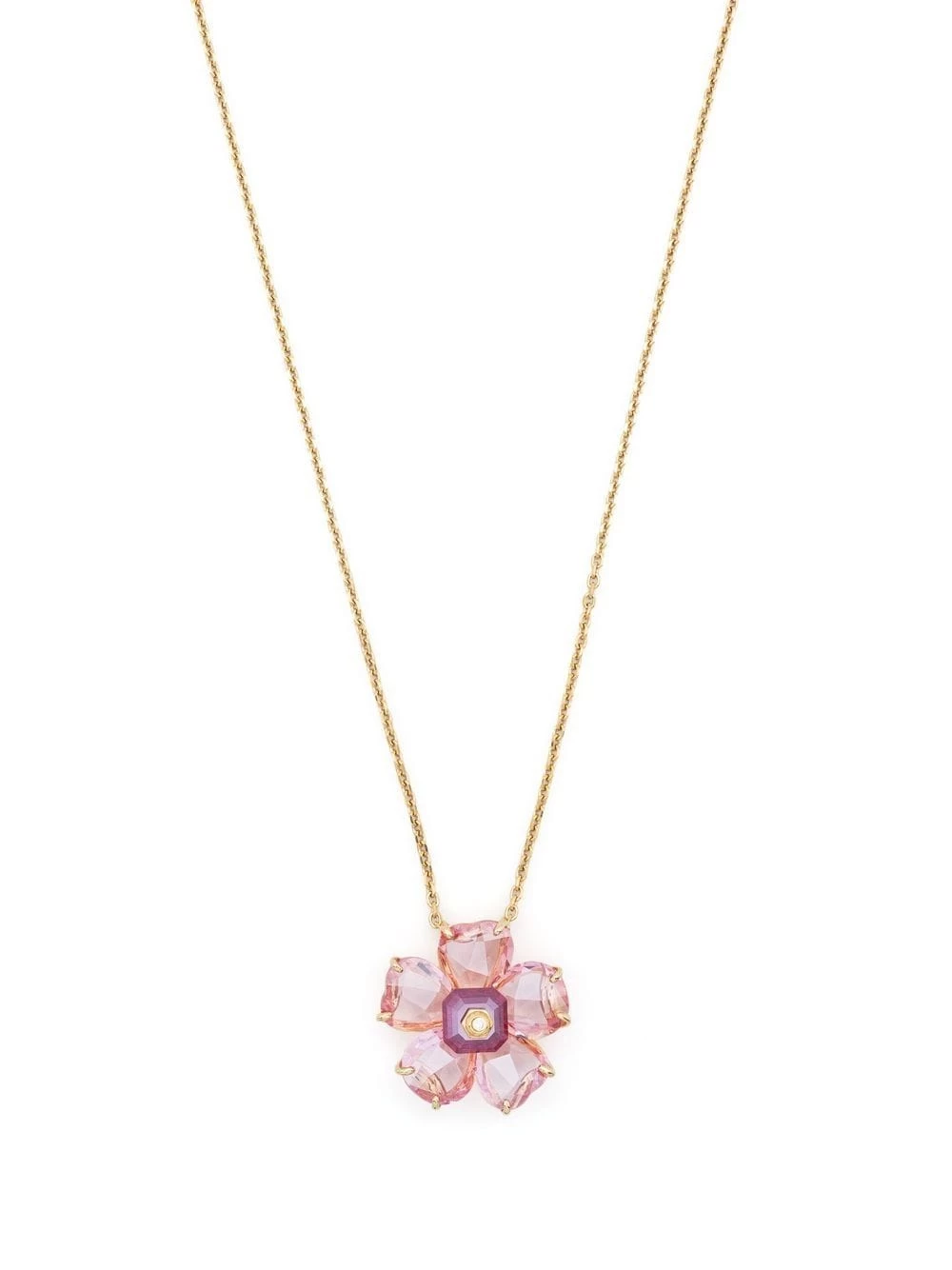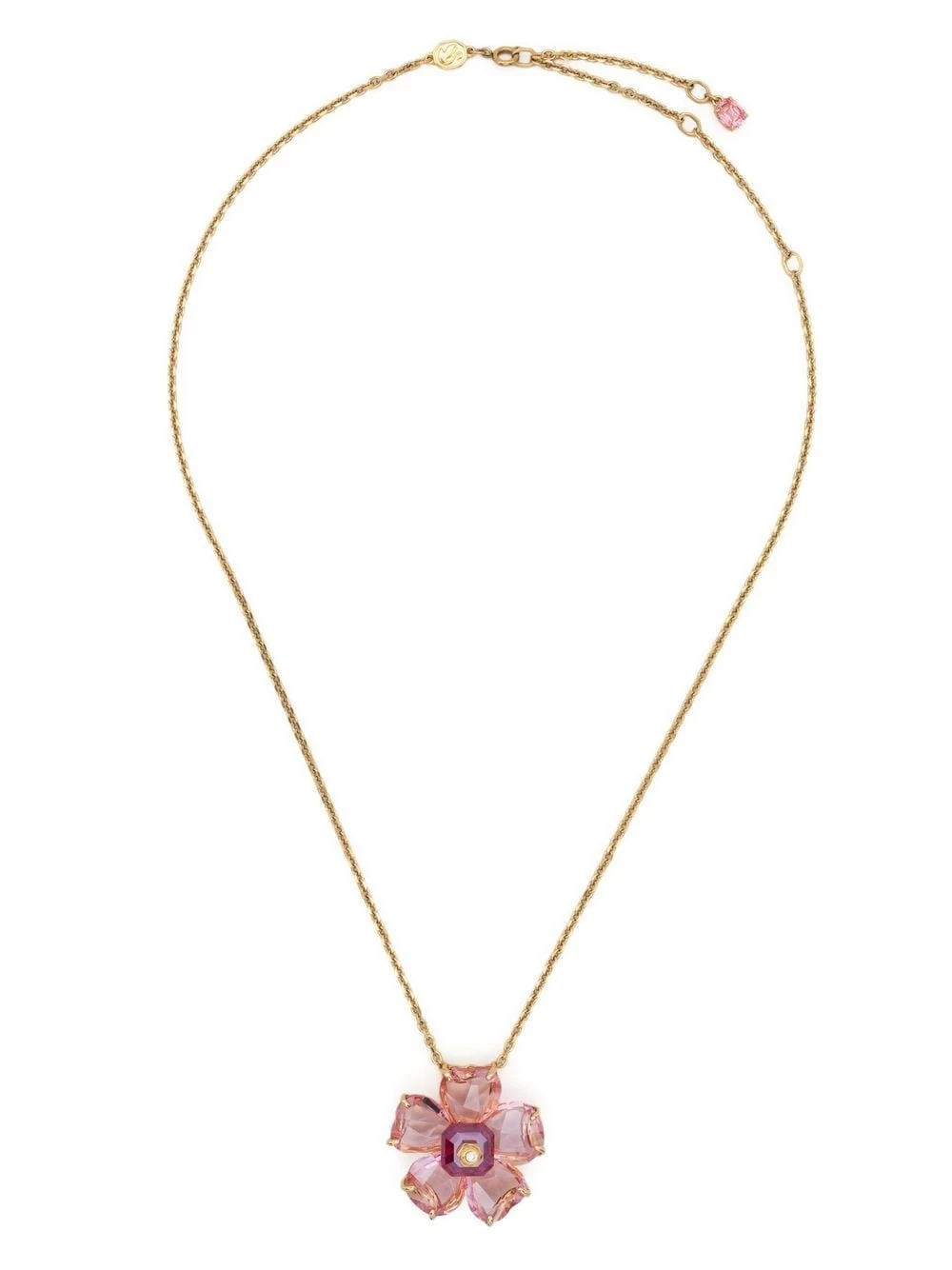 glass flower charm necklace from Swarovski featuring pink, gold-tone, glass, brass, flower charm, logo charm, adjustable-length chain and clasp fastening.
