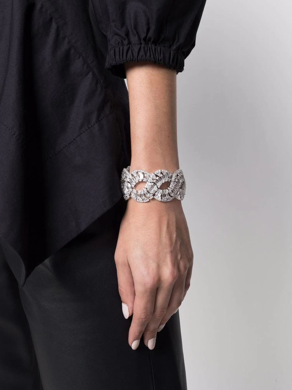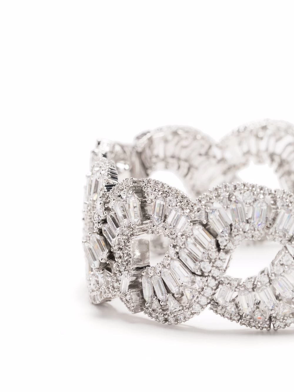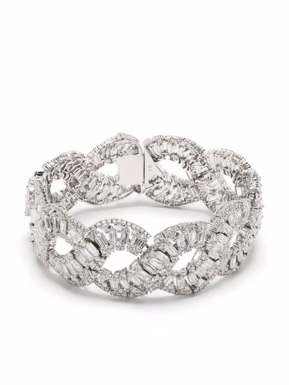 Swarovski’s bracelet is part of the brand’s Collection I. Expertly crafted with a mixed cut of clear Swarovski stones. Set on a rhodium-plated frame, this bold piece fastens with a hidden closure for a sleek appeal.Â