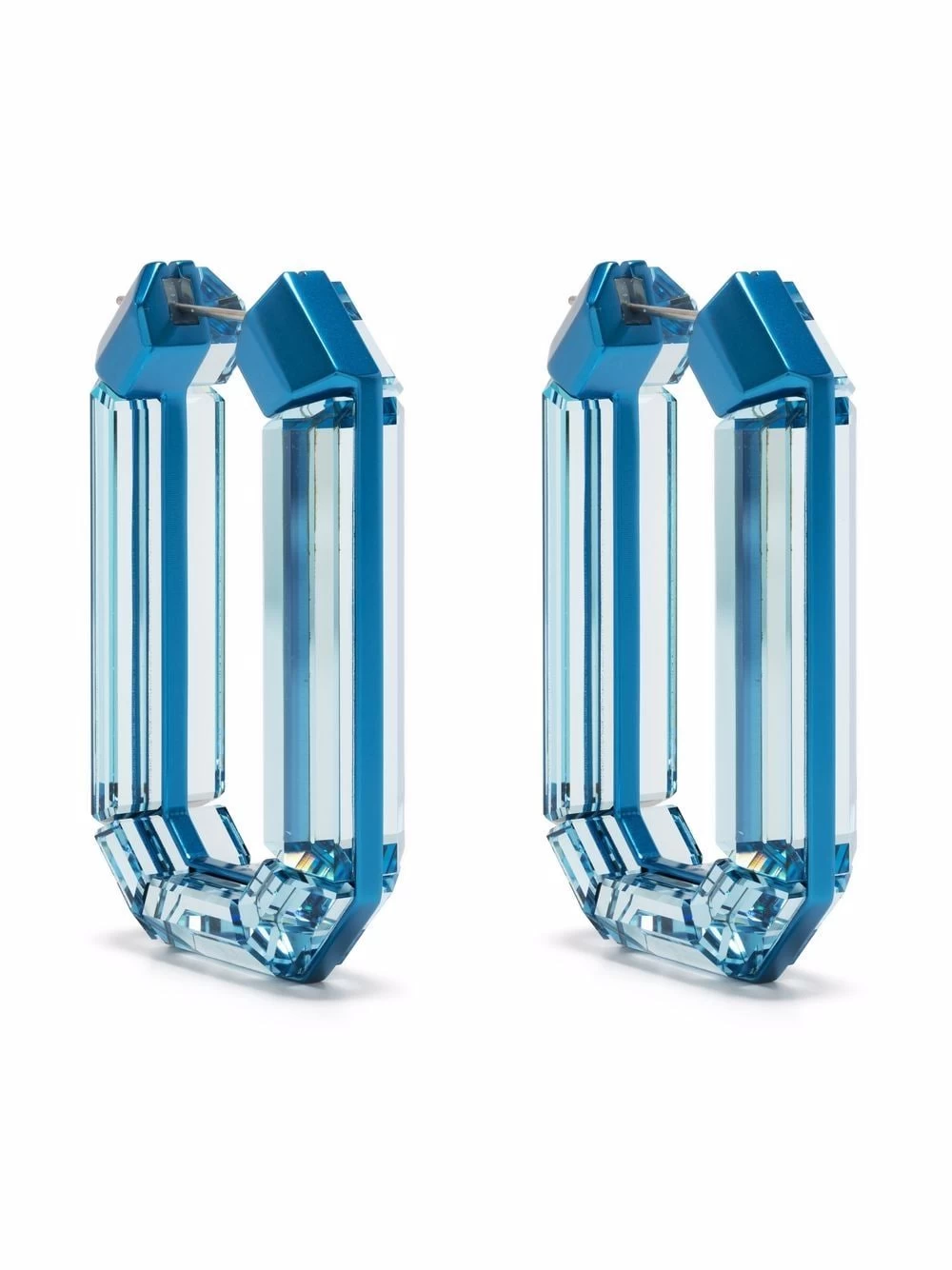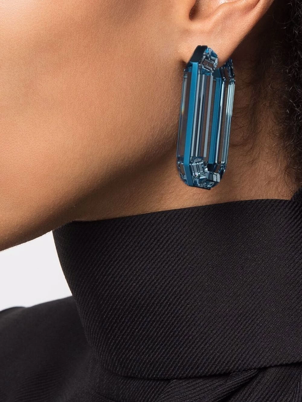 Swarovski’s earrings are a modern take on classic hoop styles. This rhodium-plated pair is accented with aqua-blue Swarovski crystals that highlight the full-cut design all the more.
