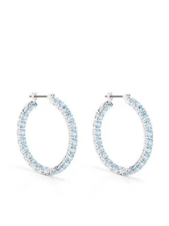 Matrix hoop earrings from Swarovski featuring ice blue, silver-tone, brass, rhodium plating, Swarovski crystal embellishment, round cut, clicker hoop design and for pierced ears. These earrings come as a pair..
