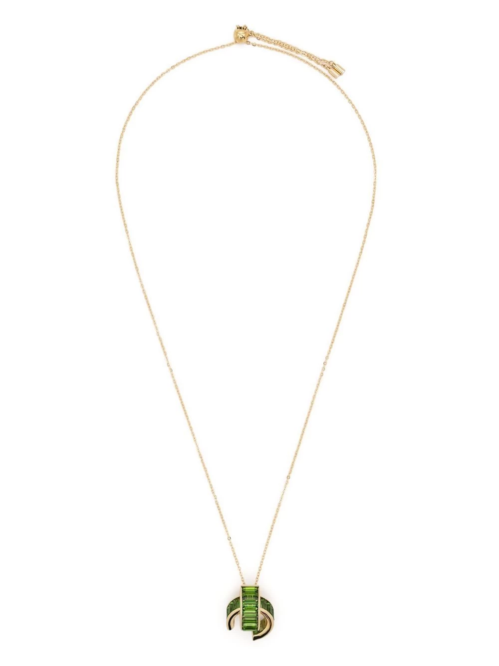Matrix pendant necklace from Swarovski featuring apple green, gold-tone, plated finish, delicate chain, statement pendant, baguette cut, crystals and sliding knot fastening.