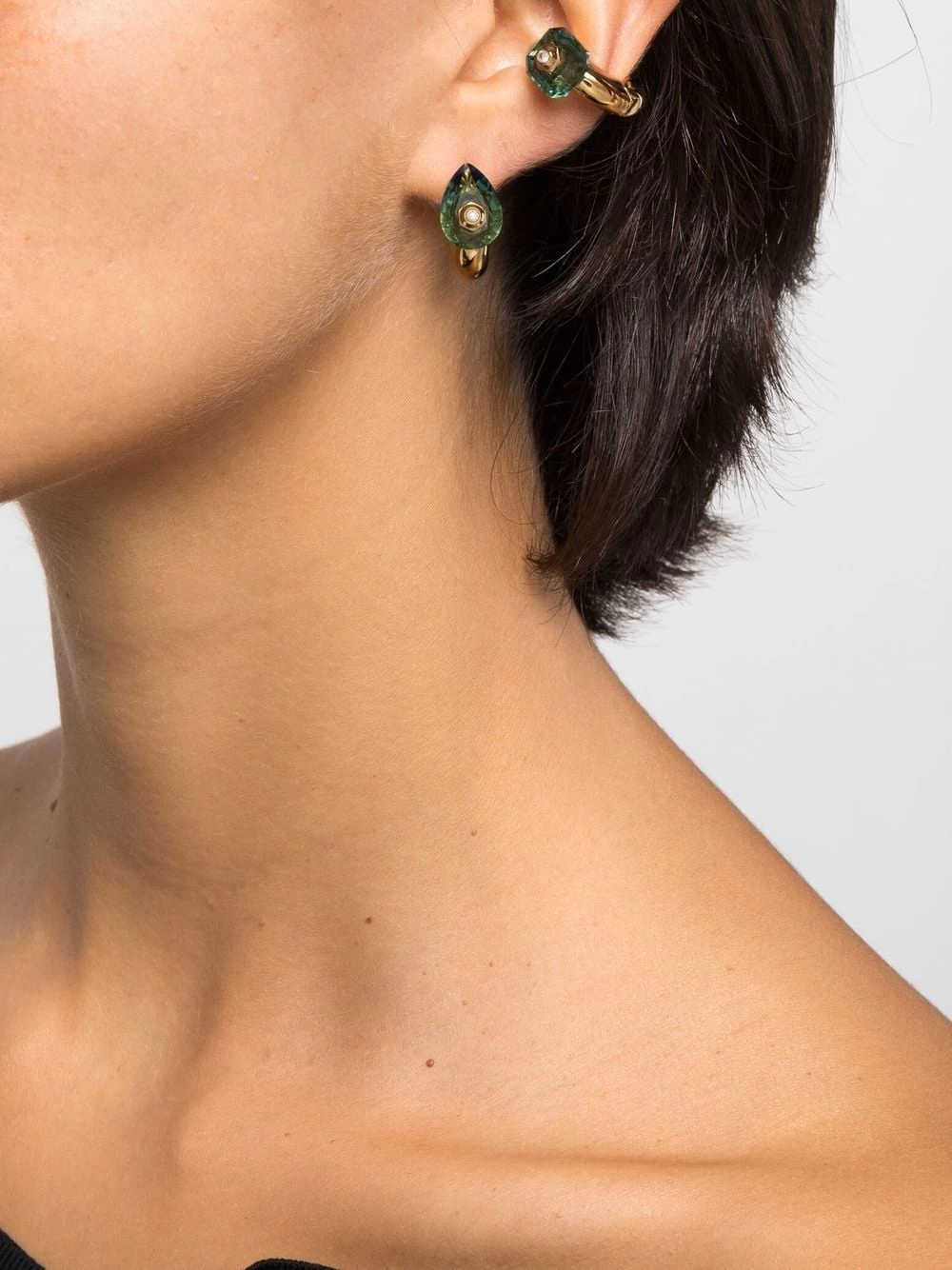 Numina three-set ear cuffs from Swarovski featuring gold-tone, emerald green, pack of three, for pierced ears and ear cuff design. These earrings come as a pair..