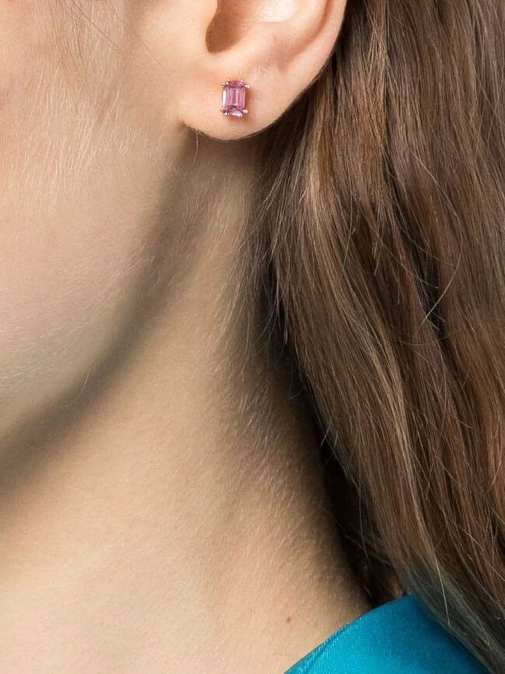 Swarovski’s gold-plated earrings are punctuated by vibrant baguette-cut crystals in a soft pink hue. Each one is nestled inside a gold-plated claw setting.