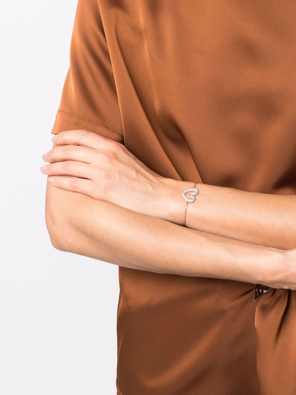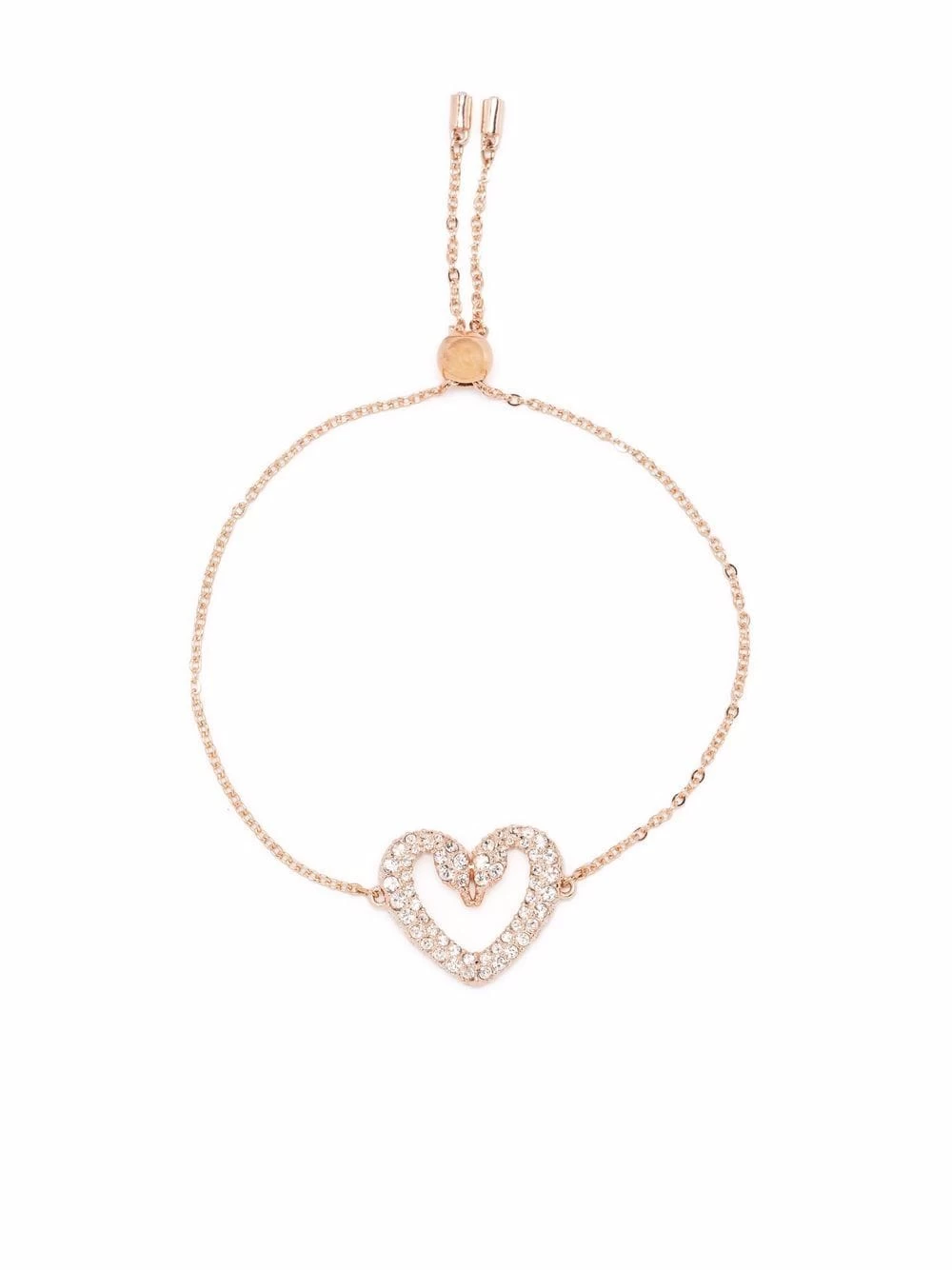 Rose gold metal Una bracelet from Swarovski featuring adjustable fit, polished finish, heart charm and crystal embellishment.